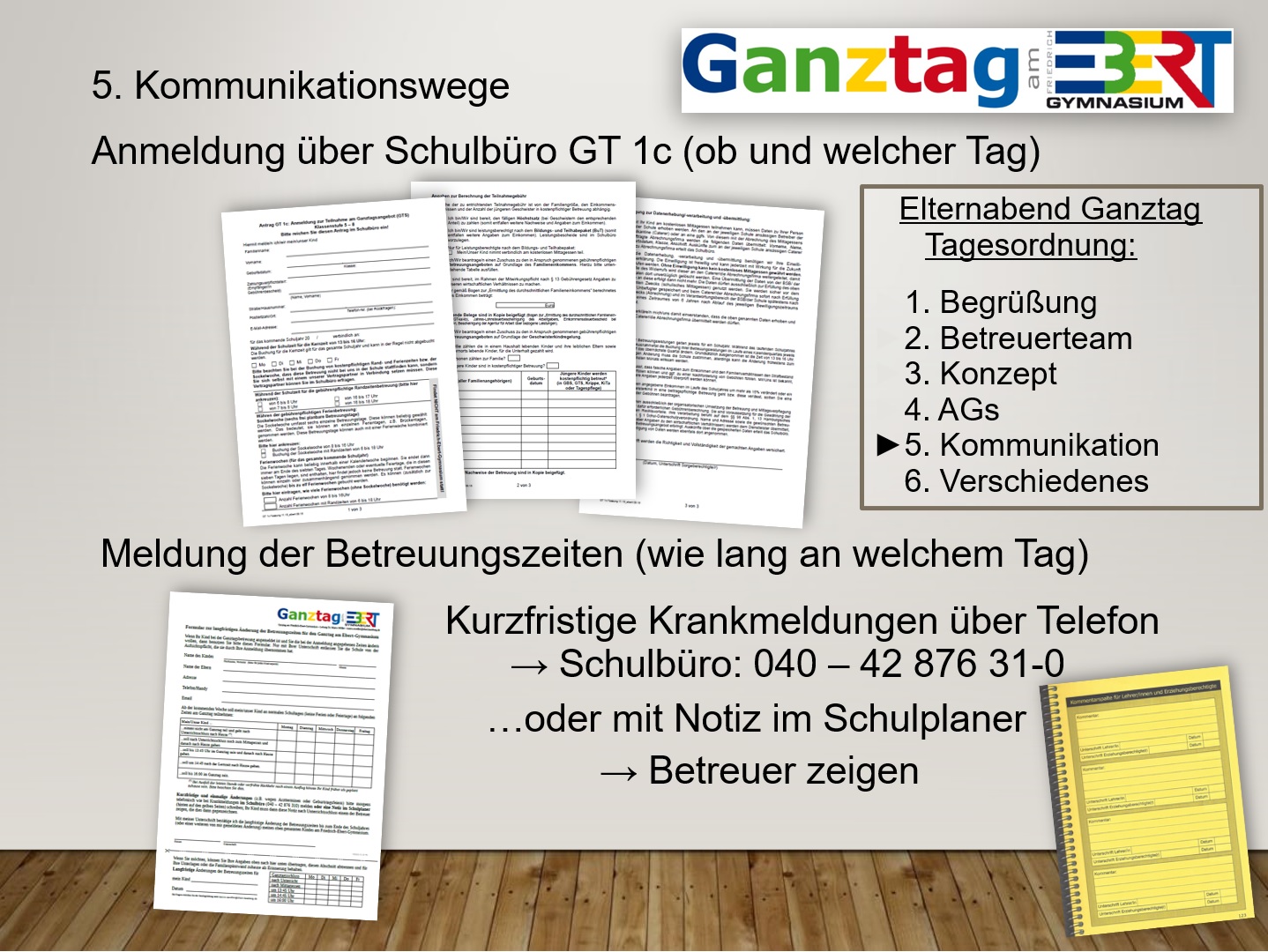 Außerhalb dieser Zeit erreichen Sie Herrn Möller per E-Mail unter marco.moeller@ebert-net.eu. Am Anfang des Schuljahres können Sie außerdem Fragen, Anregungen, Bemerkungen oder Lob auch gerne auf dem Ganztagselternabend loswerden; eine Einladung bekommen sie am Anfang des Schuljahres. ![]() |